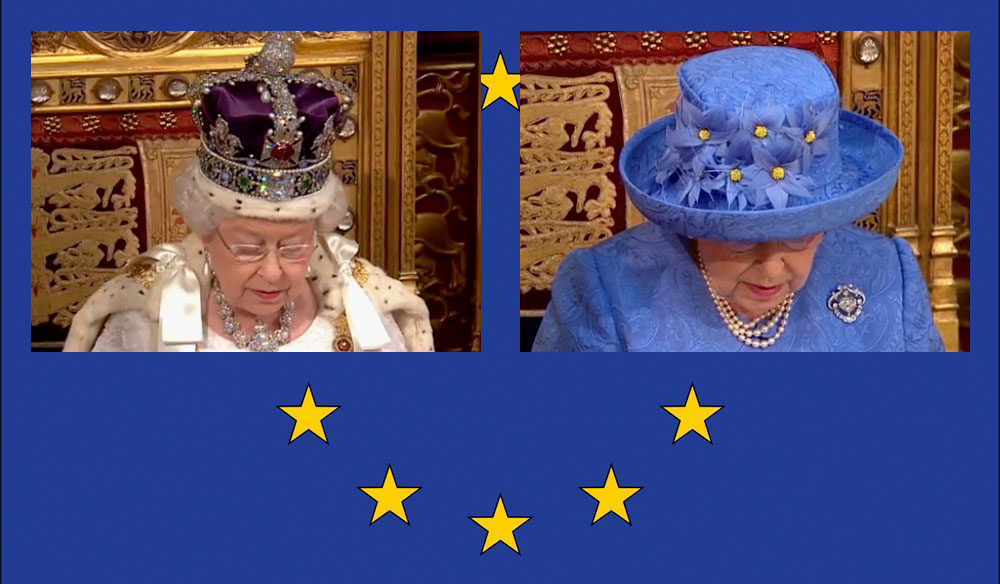 On left: how the Queen normally looks at the Queen's Speech; right: 21 June 2017 wearing a hat having an overtly EU design. © www.bbc.co.uk